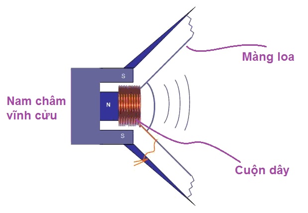 Hình ảnh minh họa về cách cuộn dây âm và nam châm tạo ra chuyển động trong củ loa.